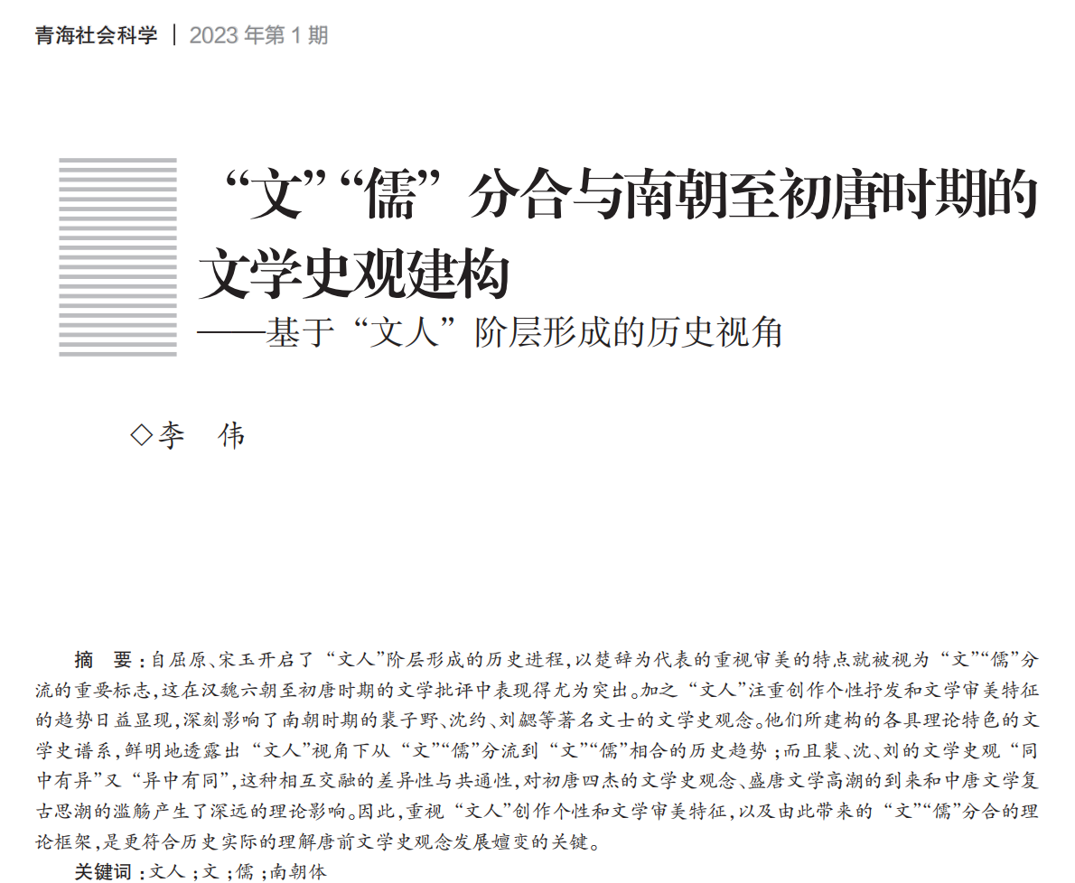 近日,我院李伟教授的论文《“文”“儒”分合与南朝至初唐时期的文学史观建构——基于“文人”阶层形成的历史视角》刊发于《青海社会科学》2023年第1期。