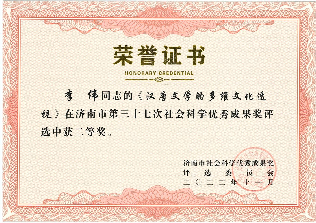 近日,济南市第37次社科成果奖正式公布,我院古代文学教研室李伟老师的著作《汉唐文学的多维文化透视》获得著作类二等奖。