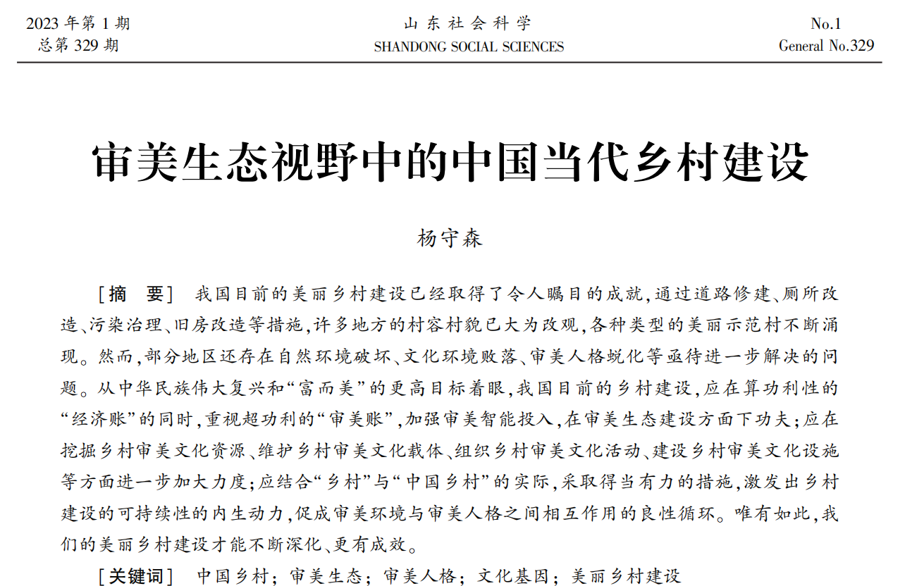 近日,我院杨守森教授的论文《审美生态视野中的中国当代乡村建设》刊发于《山东社会科学》2023年第1期。