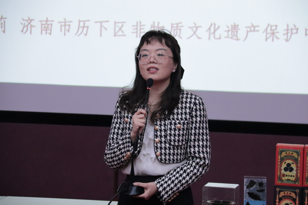 贡天府阿胶传承人闫关昌详细地介绍了贡天府阿胶制作的非遗技艺,从济南的泉水、技艺等因素着手,让师生们对阿胶的历史与传承有了更为透彻的了解。