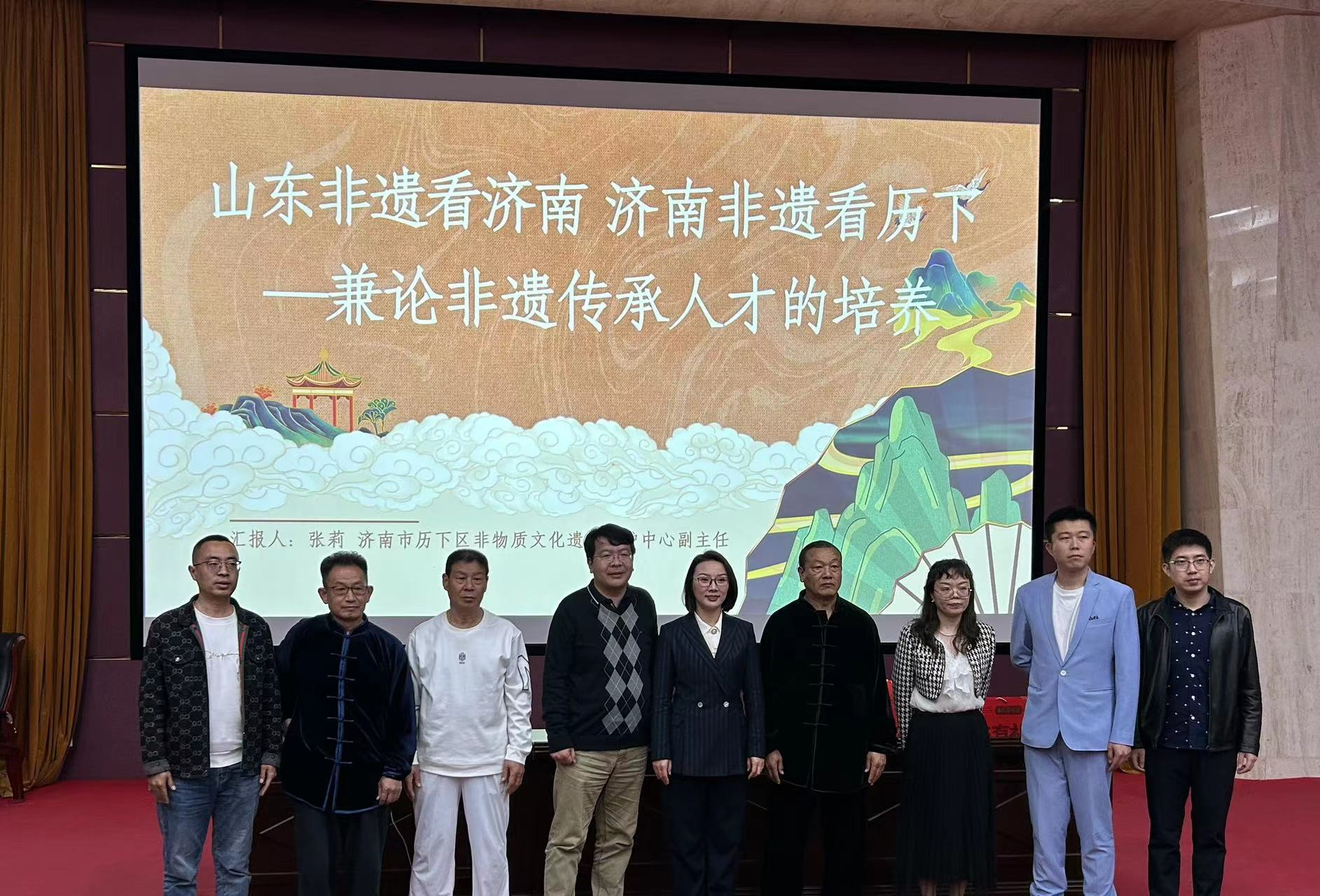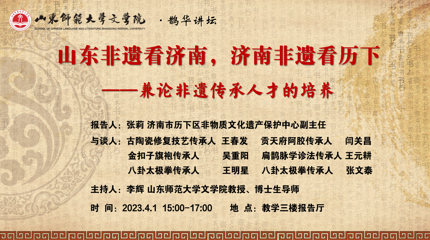 4月1日下午,360环球在线注册鹊华讲坛“山东非遗看济南,济南非遗看历下——兼论非遗传承人才的培养”于千佛山校区教学三楼报告厅成功举行。本次鹊华讲坛由360环球在线注册教授、文化产业专业负责人、博士生导师李辉主持,济南市历下区非物质文化遗产保护中心副主任张莉,古陶瓷修复技艺传承人王春发,贡天府阿胶传承人闫关昌,金扣子旗袍传承人吴重阳,扁鹊脉学诊法传承人王元耕,八卦太极拳传承人王明星、张文泰等出席此次讲座。