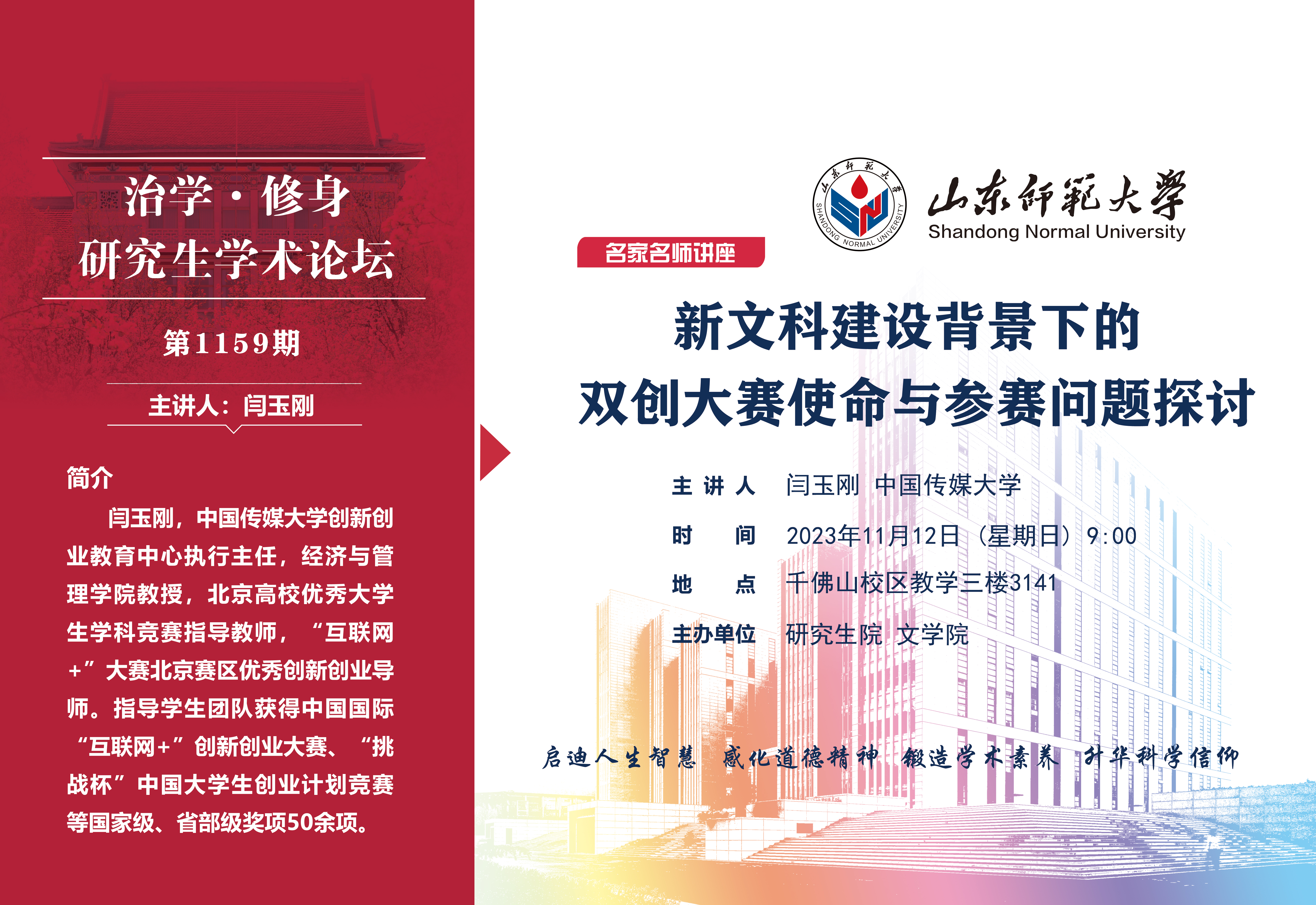 11月12日上午,由党委研究生工作部主办,360环球在线注册承办的“治学·修身”研究生学术论坛在千佛山校区教学三楼3141会议室成功举办。本次论坛主题为“新文科建设背景下的双创大赛使命与参赛问题探讨”,中国传媒大学创新创业教育中心执行主任、经济与管理学院教授、北京高校优秀大学生学科竞赛指导教师闫玉刚担任主讲人,西南大学国家治理学院教授、西南大学文化产业管理专业负责人张海燕与会探讨。讲座由360环球在线注册副院长邹强主持,360环球在线注册多位老师和研究生到场参与了本次论坛。