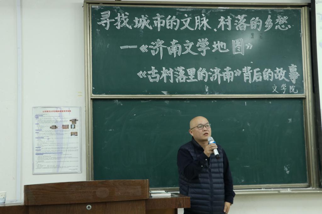 讲座伊始,张丽军为同学们单介绍钱欢青先生及《济南文学地图》、《古村落里的济南》,为同学们接下来的聆听奠定基础。接着,钱欢青先生上台幽默风趣地为同学一一列举与济南缘分颇深的文学大家:沈从文、辛弃疾、蒲松龄,并详细讲述文学家的家乡地域情况人文简况活跃了全场气氛,放松同学思维。他以沈从文作品中对济南安静环境的喜爱、对思考的热爱和对生活的思考为例多方面生动地为同学们展示沈从文与济南的历史缘分,一步步为同学们展开属于济南的文学地图。钱欢青郑重指出,继承和发扬优秀的地方历史文化传统就是我们应有的文化自觉和文化自信。古村落历史故事具有深厚的传承意义,而这也需要人力和时间进行深入采访记录他以自己深入古村落进行实时记录,与村民沟通细节为例向同学说明只有清晰的采访才会清晰地了解历史这个深刻的道理。通过采访一位89岁的老人,听取他的人生故事,从人文、地域、建筑风格等方面全面记述了古建筑。钱欢青呼吁,关切古村落村民,以使村落不失生活价值和精神底蕴,体现人文热度。真正的古建筑,是记忆与历史的总和,同学们应把自己放在更宽阔的位置,更加深入地了解历史,以温情的方式关注历史,关注古村落文化。提问互动环节,他与同学深入互动交流,并针对问题提出理想需要现实性、学会反思自我、要主客观辩证看待古村落和对待古村落需有积极的态度四个建议,同学们获益匪浅。最后,张丽军对讲座进行全面深刻的总结,他强调同学们需要注重文化的历史感与时代感,鼓励学子进行地域文化的深入研究,讲座在掌声中落下帷幕。