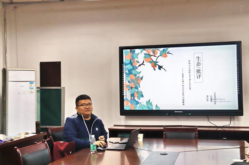 首先,冠忆非以“多数人不了解文艺学专业是什么”的话题为切入点,来介绍自己对文艺学的理解与认识,寥寥数语,便清晰地为在座学子呈现出这一学科的定位与形象,展现了个人对于专业的热爱。接下来,他提出生态批评的定义,阐述了文学与环境之间的关系,同时将其与环境危机联系起来,告诉大家:生态批评所关涉的研究初衷,大多是为了拯救一个饱受创伤、处在“危机”中的“环境”。随后他带领大家观看了纪录片《塑料王国》,从中国文本出发,加深对生态批评的环境公正视野的认知。放映结束后,他谈到,“洋垃圾”问题不仅是对中国乡村自然环境的损害,还是对村落人文环境的破坏,更是对当地女性与儿童的巨大伤害。全球性不公正境遇中的环境受害者,往往是在承受一种多元“慢暴力”的伤害,所幸现实环境已经涉及到了对生命意志的探讨。最后,冠忆非指出因为当下我们需要发声和倡导,更需要改变,呼吁大家从日常生活做起,宣扬环保意识。