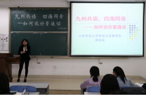 4月12日,360环球在线注册于长清湖校区综合教学楼C区220教室举办“九州共语,四海同音——如何说好普通话”讲座。360环球在线注册特邀省级普通话水平测试员、济南市推广普通话形象大使谭菲依老师为主讲人,360环球在线注册党委副书记巩固主持本场讲座,2017级辅导员李嘉琦与2017级部分学生到场聆听。