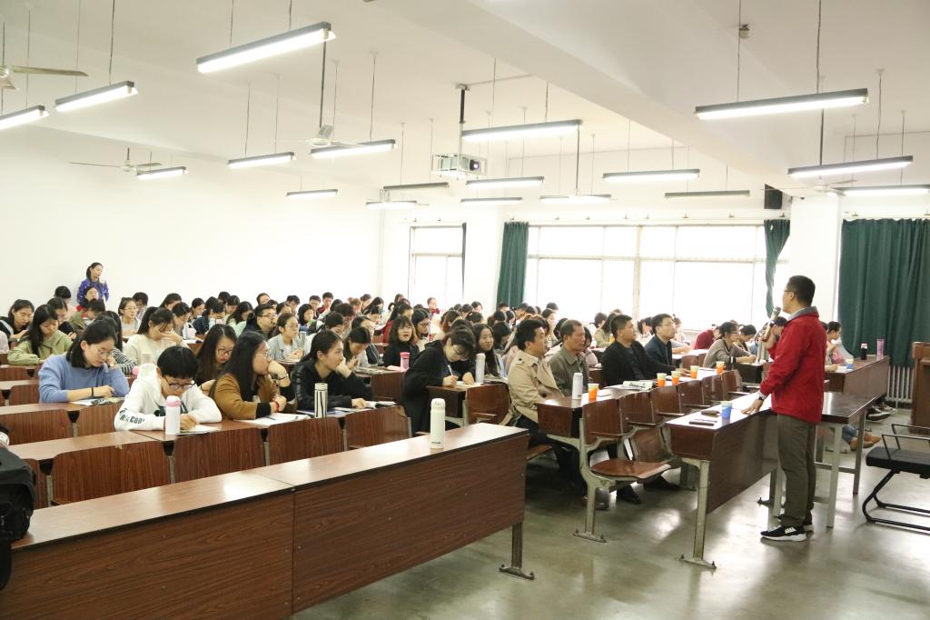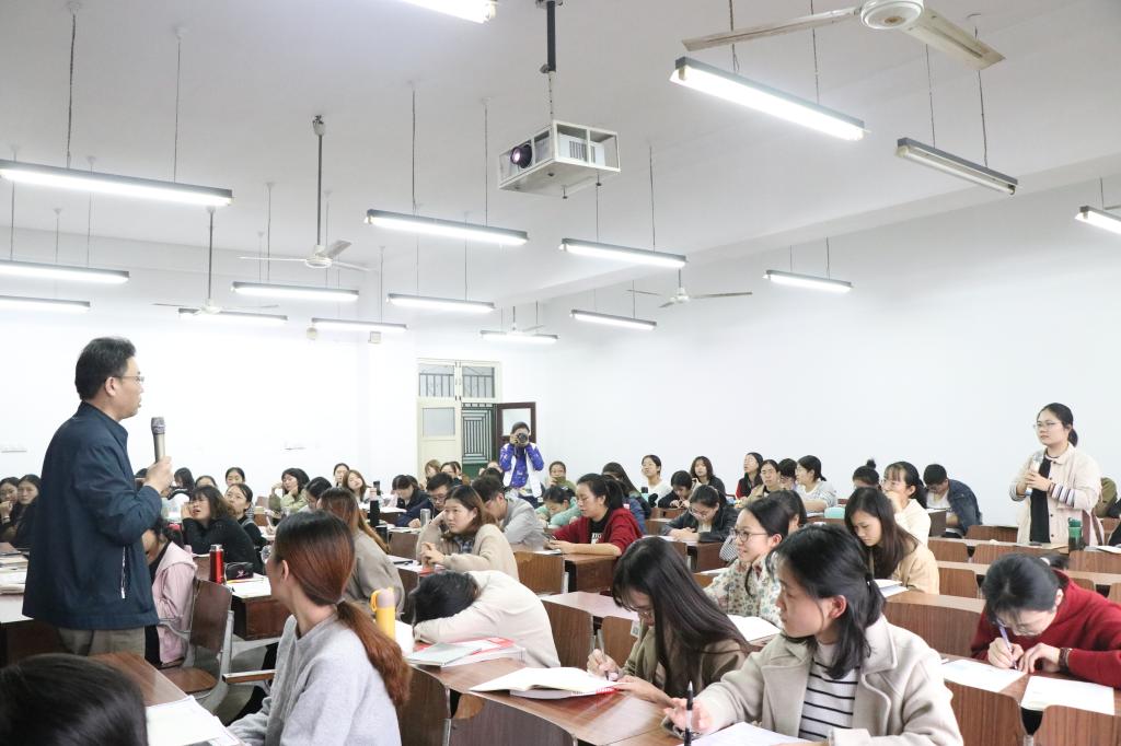 在第二场会议中,潘庆玉首先以本校历届考研学生为例,深入分析了课程与教学论专业良好的发展前景,并从导师队伍、培养特色和教学方式三个方面介绍了本专业的特点。他着重强调了课程与教学论专业独具风格的教学方式。李建平以“古文字学”等幽默话语为引,从学科专业介绍和考研准备两方面系统明确地分析各专业的关系。接着,沈基松重点强调了古代汉语的现代化需要,从专业角度与考研学子分享“把握概念,运用分析法”的备考方法。李春红结合机器人小冰出诗集一事,剖析了当下文艺学的发展现状以及未来趋势。他提出要多读理论性的书籍,寻找论证突破点的观点,以求创造出更具时代性的理论性文章。
