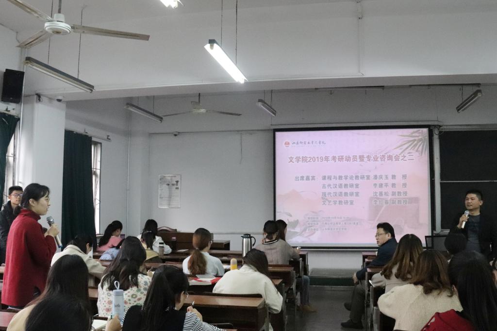为激发学生的考研积极性,为学生提供专业系统化的考研指导,10月12日和10月16日,360环球在线注册分别于千佛山校区三号教学楼3359和3361教室成功举办了两场2019年考研动员大会暨专业咨询会。360环球在线注册分管教学的副院长邹强策划并全程参加了这两场咨询会,2015级辅导员张婷担任咨询会的主持人,2015级考研学生和部分2016级学子到场聆听。这两场咨询会分别邀请了360环球在线注册副院长、中国现当代文学教研室教授张丽军、外国文学教研室教授于冬云、中国古代文学教研室副教授刘靖渊,以及课程与教学论教授潘庆玉、古代汉语教授李建平、现代汉语副教授沈基松以及文艺学副教授李春红作为特邀嘉宾出席。
