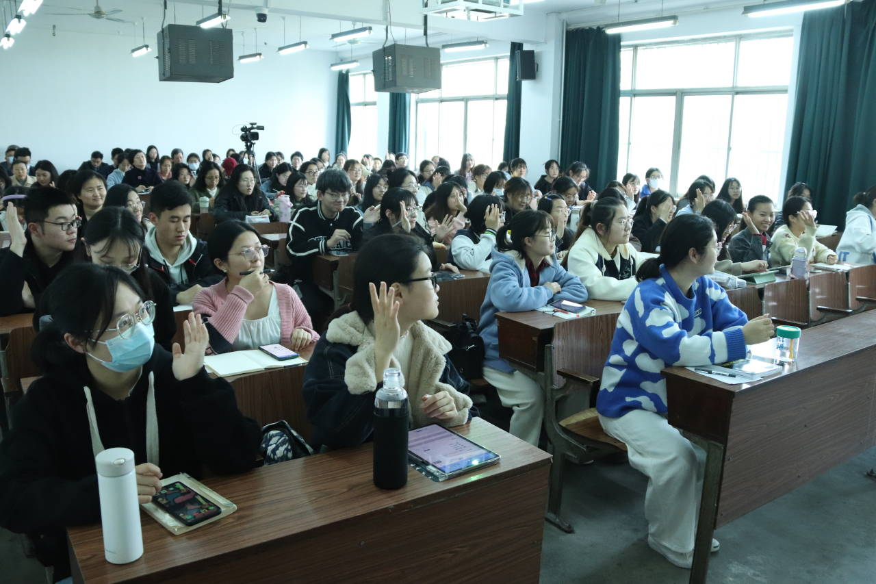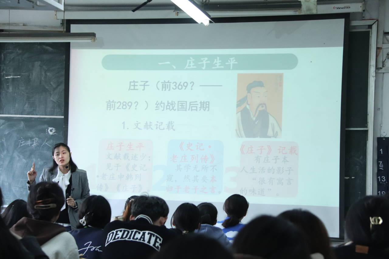本次教学观摩活动分为课堂展示和课后交流两个环节。在苗江磊的引导下,课堂由学生进行“庄子寓言”课堂汇报展示为起点正式开始。根据学生汇报内容,苗江磊对其进行简要点评,紧接着以庄子其人、《庄子》一书为内核,深入浅出地讲述庄子生平、庄子与楚文化的渊源关系、《庄子》寓言故事和《庄子》思想及后世影响,在与学生的互动中系统阐述庄子和其论著的广泛影响,为学生营造轻松愉快课堂氛围的同时,达到促进学生对中国古代名家名作的理解、吸收和应用的教学目标。