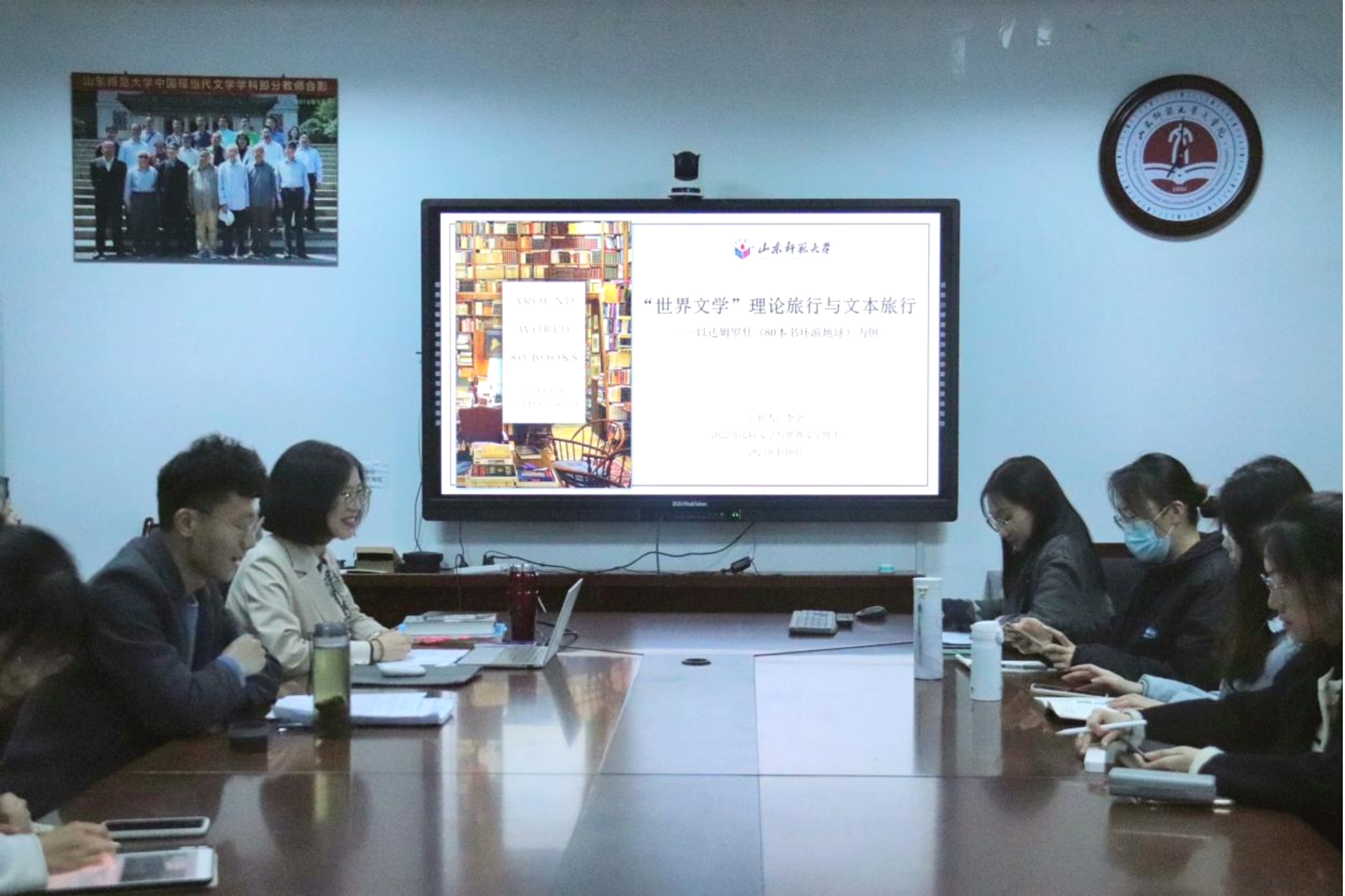 接着,李金探讨了世界文学的“三重定义”在《80本书环游地球》文本中的体现。她从作家的选择与椭圆形折射、世界文学版图与翻译作为“方法”、超然的阅读模式——近读和远读的平衡三个层面展开论述。李金认为,《80本书环游地球》是一次跨时空、跨媒介、跨语言的世界文学之旅,也是跨越后疫情时代保守主义和封闭主义的隔阂的文学行为艺术。然而这场文学之旅依然受制于达姆罗什的个人立场,是单向的跨越,而不是多元的联系和触发,具有强烈的个人色彩。因此,同学们在阅读时也应辩证看待。