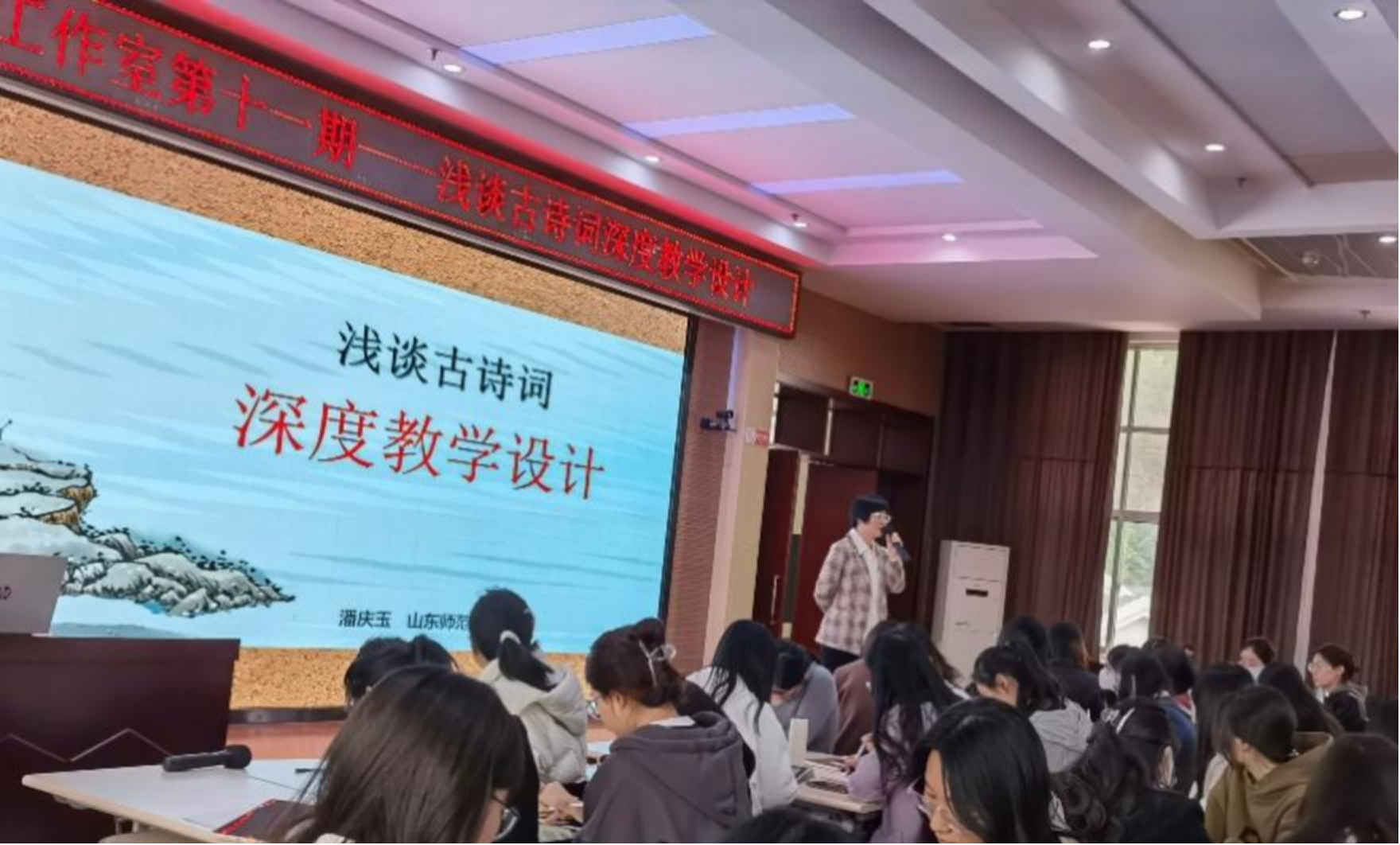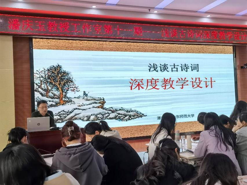 活动进行第二项,由潘庆玉教授作题为“浅谈古诗词深度教学设计”的讲座。潘教授从文本解读和教学设计两个层面,结合具体教学案例跟领导老师同学们进行分享。关于文本解读,潘教授提到四个层面:一是语言层面,教师要选择好内容和形式;二是形象层面,要让学生进行想象和创造;三是经验层面,让学生产生具象化认知;四是心理层面,注重个性化反应;五是文化层面,讲究互文性对话。关于教学设计,潘教授从七个角度来分享:一是做好布局,规划路径;二是要勾勒,框定内容;三是描绘,创设情境;四是留白,认知挑战;五是照应,注重牵引勾连;六是渲染,比兴共情;七是点睛,达到瞬间永恒。