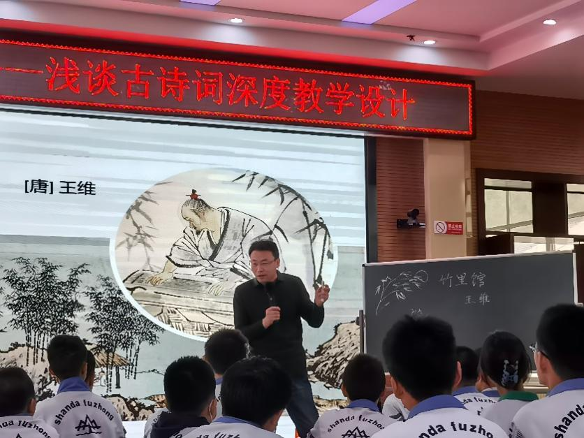 第二堂课由潘庆玉教授执教。潘教授聚焦诗歌文本思想内涵,“赏画”“知人”“觅音”“写意”“禅机”各环节衔接自然,层层深入,惊喜连连。整堂课引领学生走进诗词内部,陶醉于浓郁幽深的文化诗意,开拓了视野,提升了认知,深化了体验,赢得掌声阵阵。课堂伊始,潘教授从板书上的“竹”图入手,链接诗中之“篁”,将学生们的视线聚焦于“竹林”文化,使学生快速进入教学情境;接着,学生在配乐声中朗读诗篇,优美清冽的琴声,使学生不自觉地放慢语速,调整语调,对诗歌有了初步的情感体验;在赏画环节,潘教授引导学生想象画面、描绘情境,畅所欲言;接着,潘教授带领同学们走进王维“其人”,以回环复沓的诵读方式一次次走进王维的内心深处,感悟流淌在那悠扬的琴声与长啸中的复杂多变的情思;在“觅音”环节,潘教授抓住“长啸”这一意象,结合诗歌情感内涵进行极致挖掘,通过示范、表演、观看视频激发学生内在情怀,形成对“啸”的具身体验和文化认知;“写意”环节,以诗歌的创作时节为支点,鼓励学生大胆想象,创意写作,学生的展示视角独特,文采斐然,“知音”的点评也一语中的,精彩不断;课堂结尾,潘教授带领学生体验明月“来相照”与“自相照”、“本相照”、“犹相照”的区别,感悟高古禅意背后的一脉温情,把学生对诗歌内涵的理解提升到一个新的高度,并用罗曼·罗兰的名言作结;最后,学生们在《竹里馆》的视频欣赏中回味着诗篇之情感,体味古诗词之隽永。
