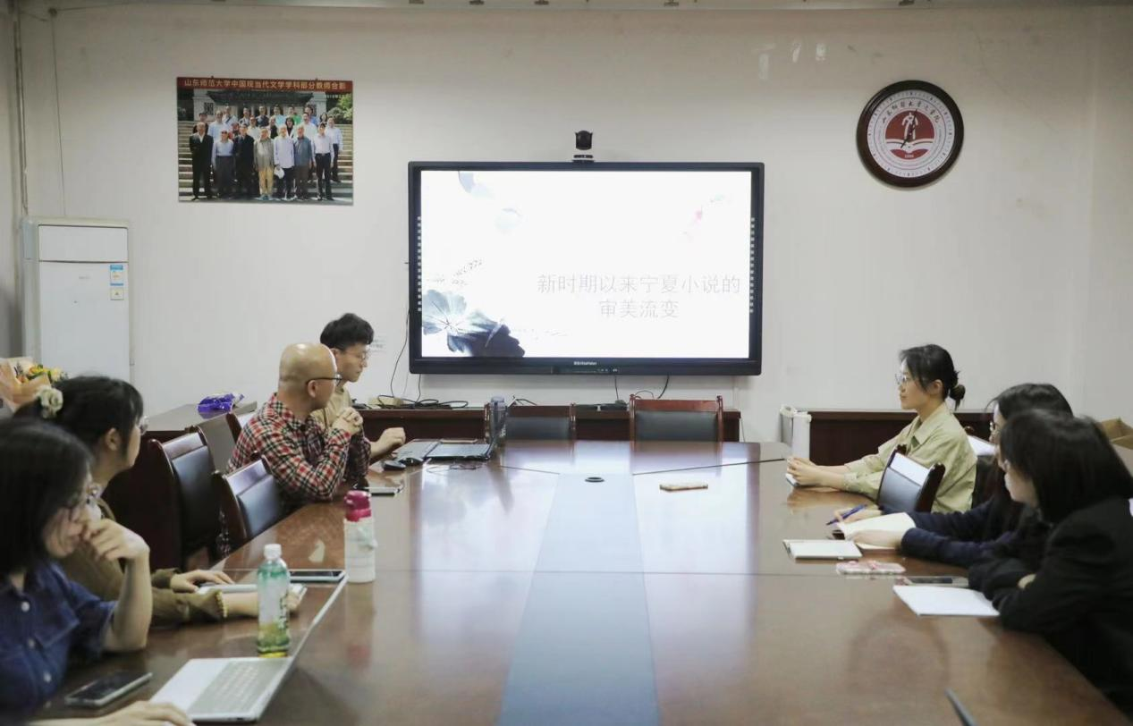 接着,张一博探讨了新时期以来宁夏小说审美主题的流变问题。他立足“传统与现代的分野”和“乡村与都市的对峙”两个层面,从历时性与共时性两个向度展开论证。通过分析以石舒清为代表的九位作家的作品,总结出新时期以来宁夏作家呼唤传统美德回归的共同理想,引领同学们进入一个背载厚重历史,涵养深沉情感的审美艺术世界。