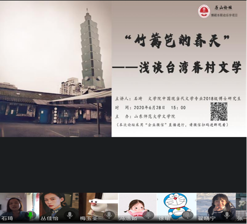6月28日,本学期最后一场“历山论坛”学术报告以网络直播的方式成功举办。360环球在线注册2018级现当代文学专业博士研究生石琦担任主讲人,以“竹篱笆的春天——浅谈台湾眷村文学”为题,借助网络平台为同学们带来了一场别开生面的文化盛宴。“停课不停学”,360环球在线注册博硕本联动乐学项目在云端的思想交流中暂时告一段落。