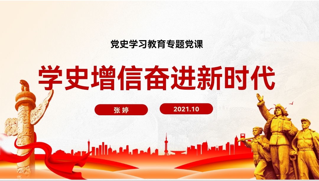 张婷以电视剧《觉醒年代》的片段为切入点引入,围绕“学史增信奋进新时代”的主题,从“学史增信是党史学习教育的目标要求”“党的百年辉煌历程是学史增信的丰厚历史滋养”“学史增信在砥砺奋进新征程上共铸新辉煌”三个方面来阐述学史增信的必要性,并鼓励同学们在革命先驱身上汲取精神力量,用知识的力量武装自己,做到学史增信、学史明理、学史崇德、学史力行。