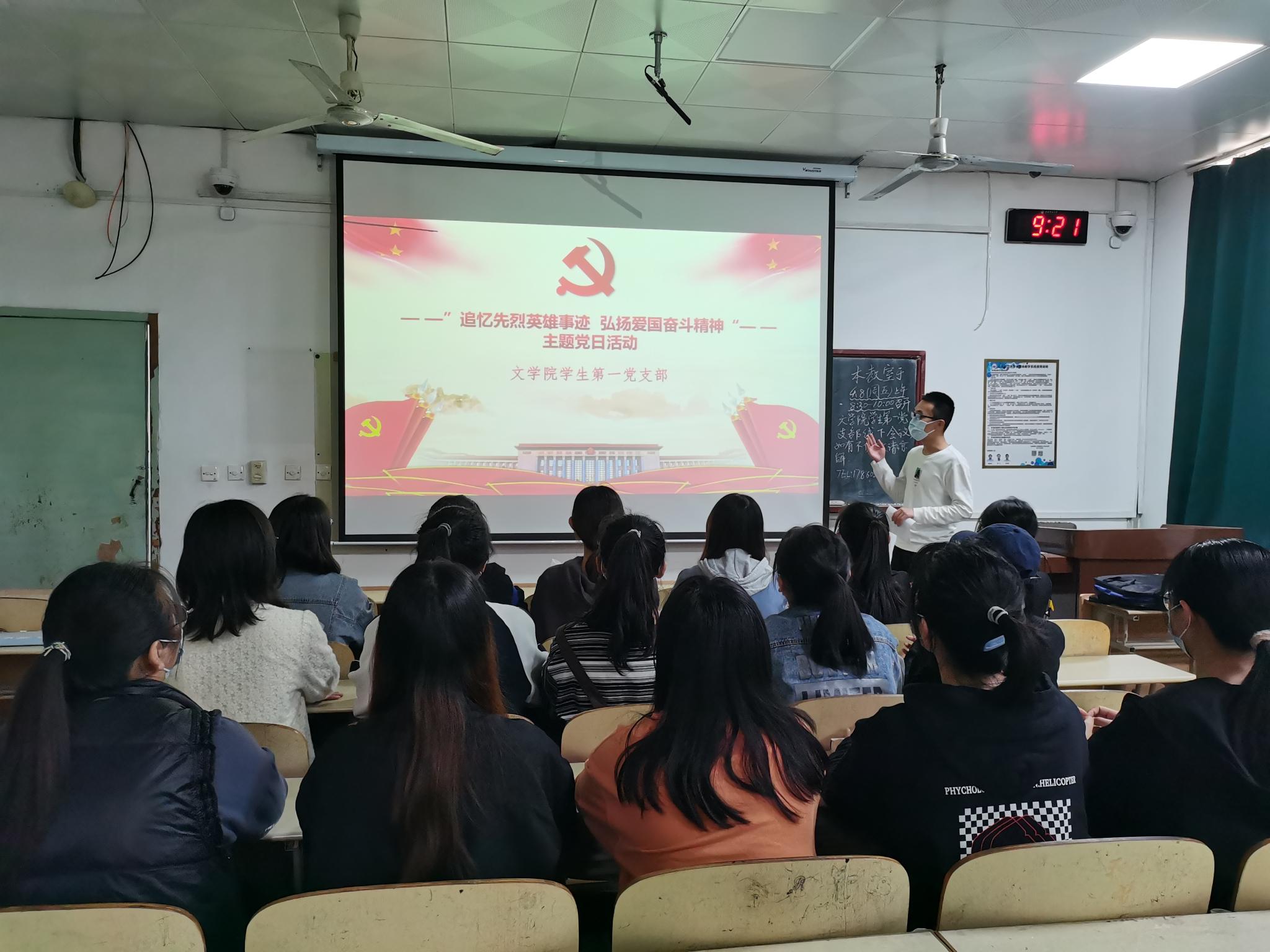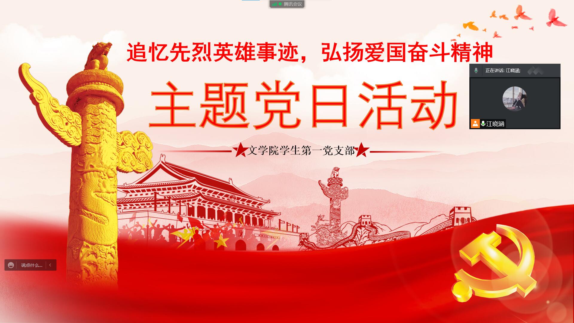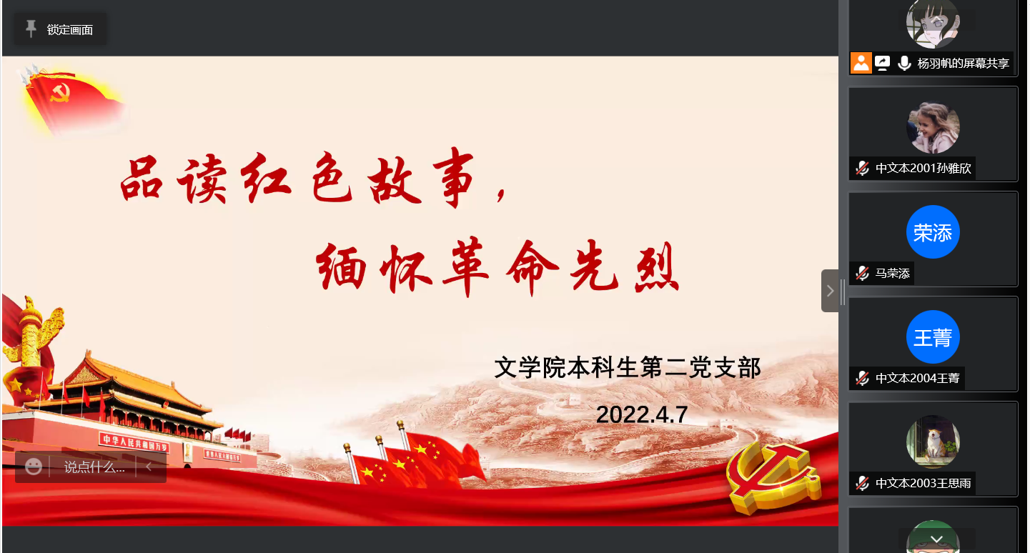 红色经典,青年党员忆初心。4月7日,本科生第二党支部开展“品读红色故事,缅怀革命先烈”主题党日活动,党支部书记张海洋、入党积极分子代表杨羽帆主持活动。会议伊始,杨羽帆通过视频形式向与会成员介绍革命先烈赵一曼同志,通过一封封绝笔信,展示出赵一曼的拳拳爱国之心和民族气概。紧接着,与会成员纷纷分享自己所了解的红色故事,其中,中文本2001班周玟希讲述的年仅19岁的董存瑞烈士为共产主义事业而光荣献身的故事格外令人动容。文师本2001班刘晓雅深受震撼,慨然发言:“中国共产党是时代的中流砥柱,是中华民族的脊梁!”最后,张海洋对会议作出总结,他强调,烈士倒下仍是一座丰碑,身处和平年代的我们更应心怀感恩,铭记革命历史,传承红色根本,在建设祖国的道路上行稳致远。