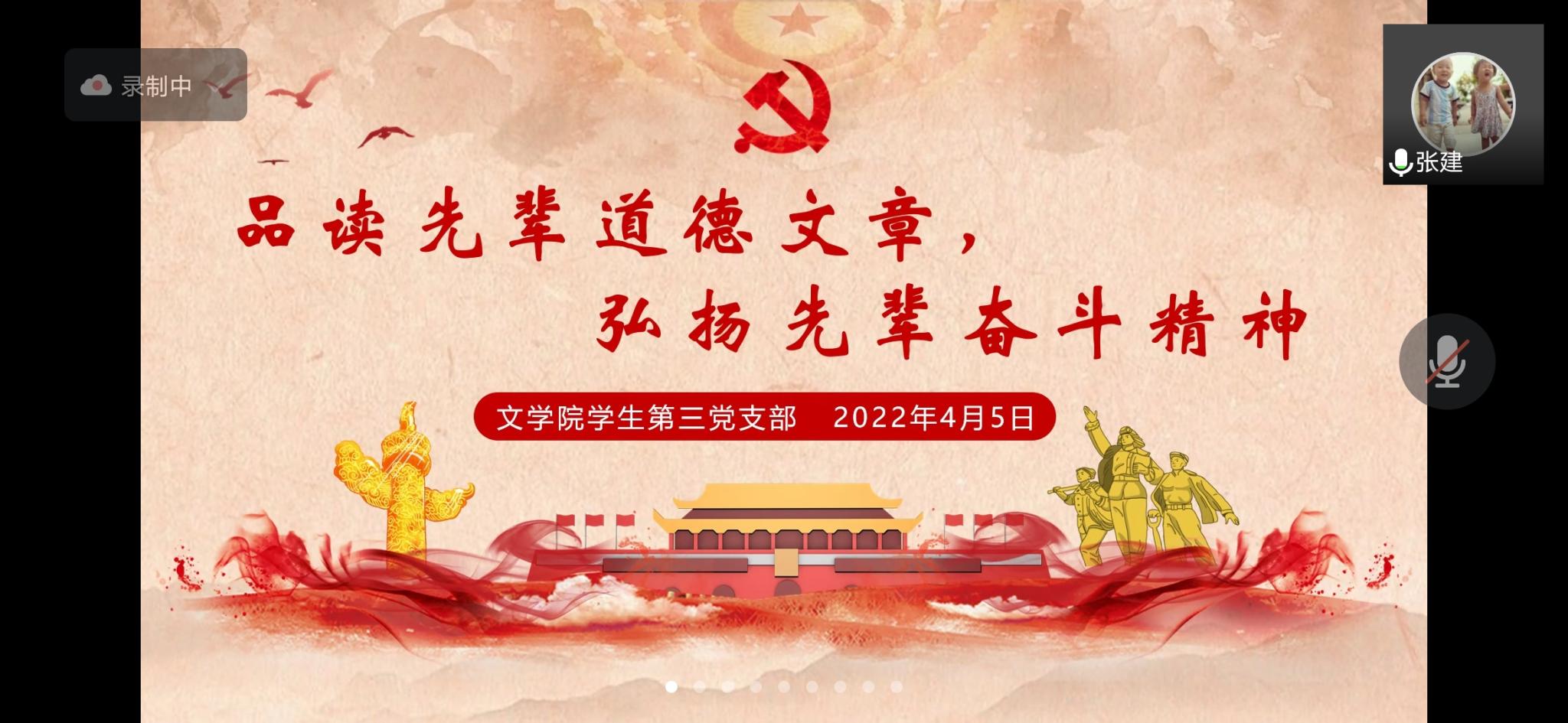 薪火相传,青年党员悟使命。4月5日,本科生第三党支部书记张建主持开展“品读先辈道德文章,弘扬先辈道德精神”主题党日活动。活动过程中,与会成员依次分享有关革命先辈的诗歌、家书和碑文,向英雄前辈致敬。中文本1906班崔蕊详细介绍了济南泺口九烈士纪念碑碑文,短短的150余字将烈士不朽的精神接续传递。文综本1901班付一凡分享《史砚芬给弟妹的家书》,在史砚芬烈士对家人的不舍与牵挂中,读出了其英勇赴死、绝不叛党的革命信念。谈及思想感悟,汉语言1901班肖清三结合自己读过的革命先烈的家书,感同身受地提出新时代青年人更应不忘初心,脚踏实地,为国家建设添砖加瓦。结合当前的疫情防控形势,张建特别指出,各位预备党员更应以身作则,以党员的标准严格要求自己,群策群力,共克时艰。