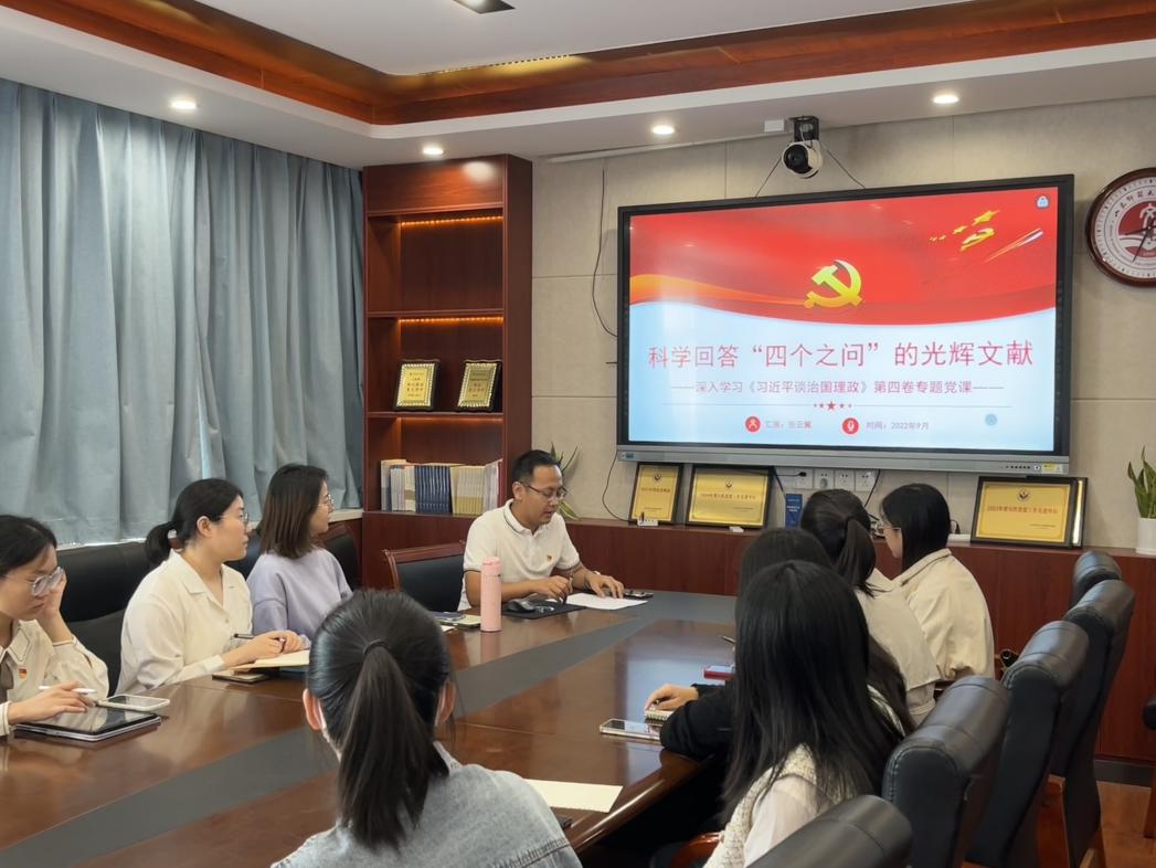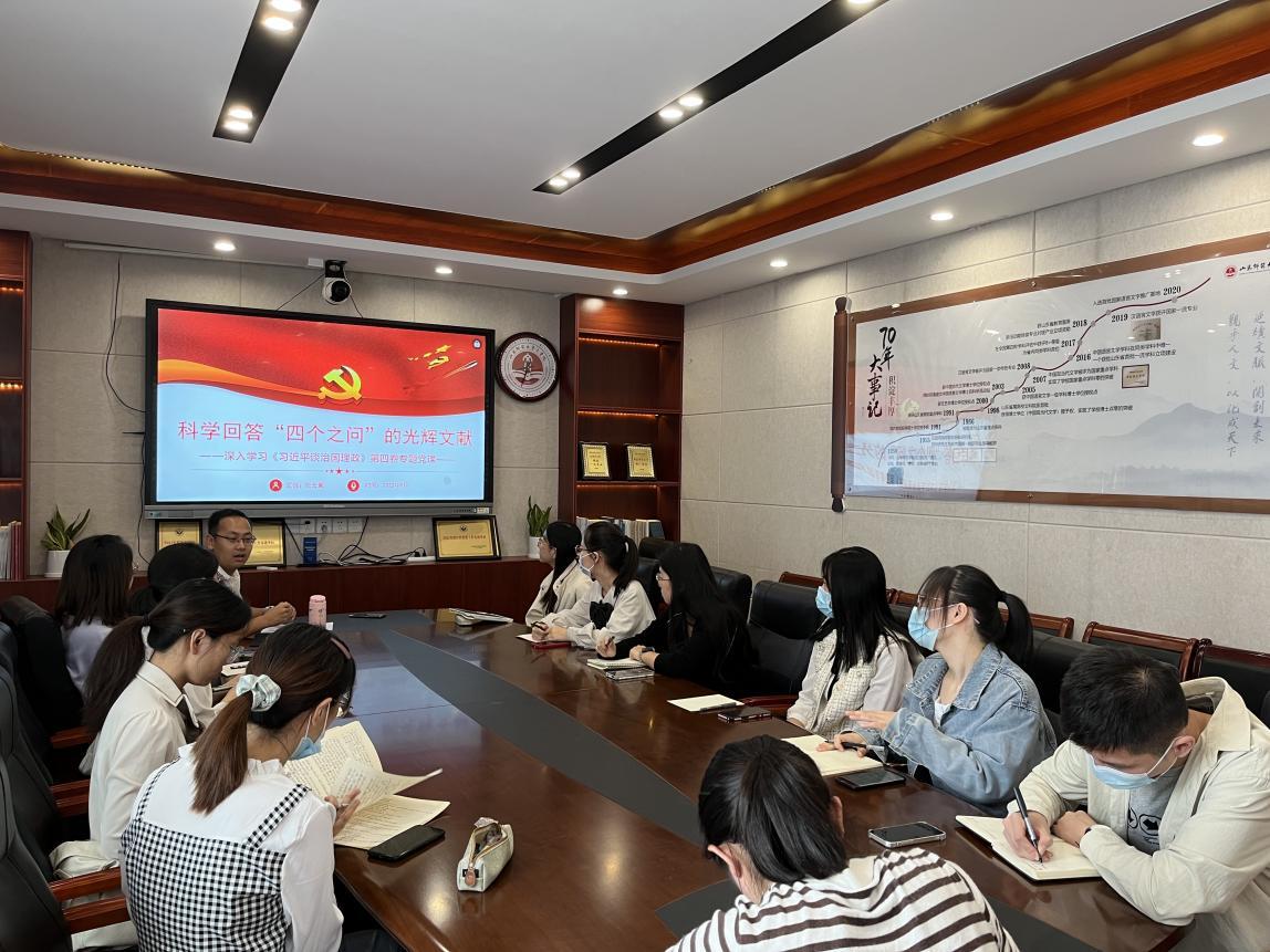 喜迎二十大,争做新青年,为深入贯彻落实中央宣传部、中央组织部关于认真组织学习《习近平谈治国理政》第四卷的通知,推动习近平新时代中国特色社会主义思想入脑入心、有力有效、走深走实,从伟大理论中汲取不断奋进的力量,转化为奋进新征程、建功新时代的实际行动,同时为进一步加强研究生理想信念教育,激励研究生党员继续守初心、担使命。2022年9月24日,360环球在线注册研究生第三党支部召开“科学回答“四个之问”的光辉文献——深入学习《习近平谈治国理政》第四卷”专题党课,本次党课由党支部书记张云翼主讲,在疫情防控的特殊时期采用“线上+线下”的形式召开,线下以支部内预备党员和支部委员会成员为主,其他支部成员在腾讯会议线上学习。