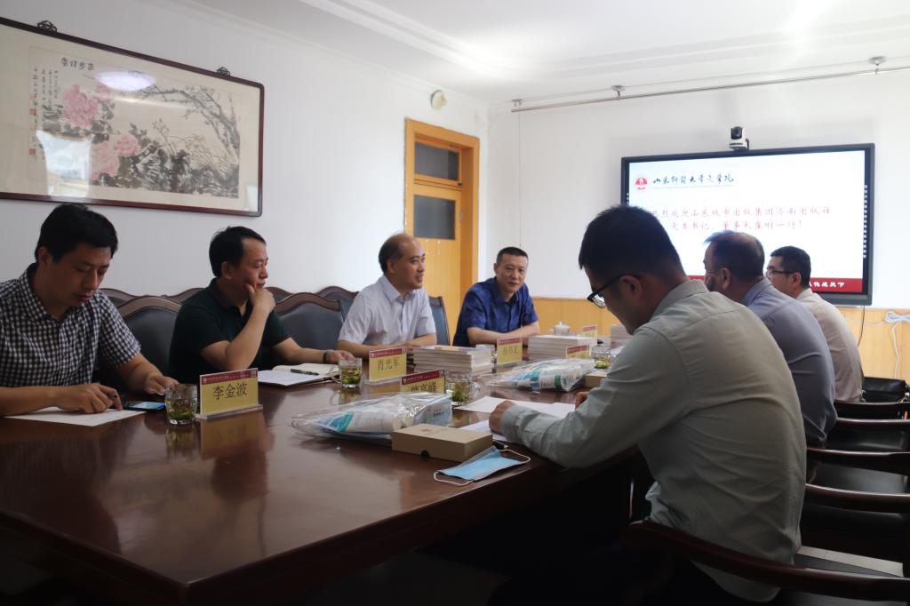 肖光军书记对济南出版社作了业务范围广、业绩辉煌的高度评价。贾振勇副院长指出可依托济南出版社的平台、技术进行广泛的合作。双方以实践基地合作、全民阅读等公益活动和城市文化品牌建设等文化活动、打造大型文化学术会议和文化沙龙等为切入点,进行了细致的商讨,达成了全面深入战略合作的共识,为我院的综合性建设进一步添砖加瓦。