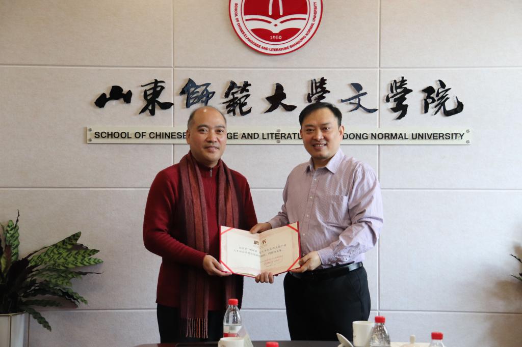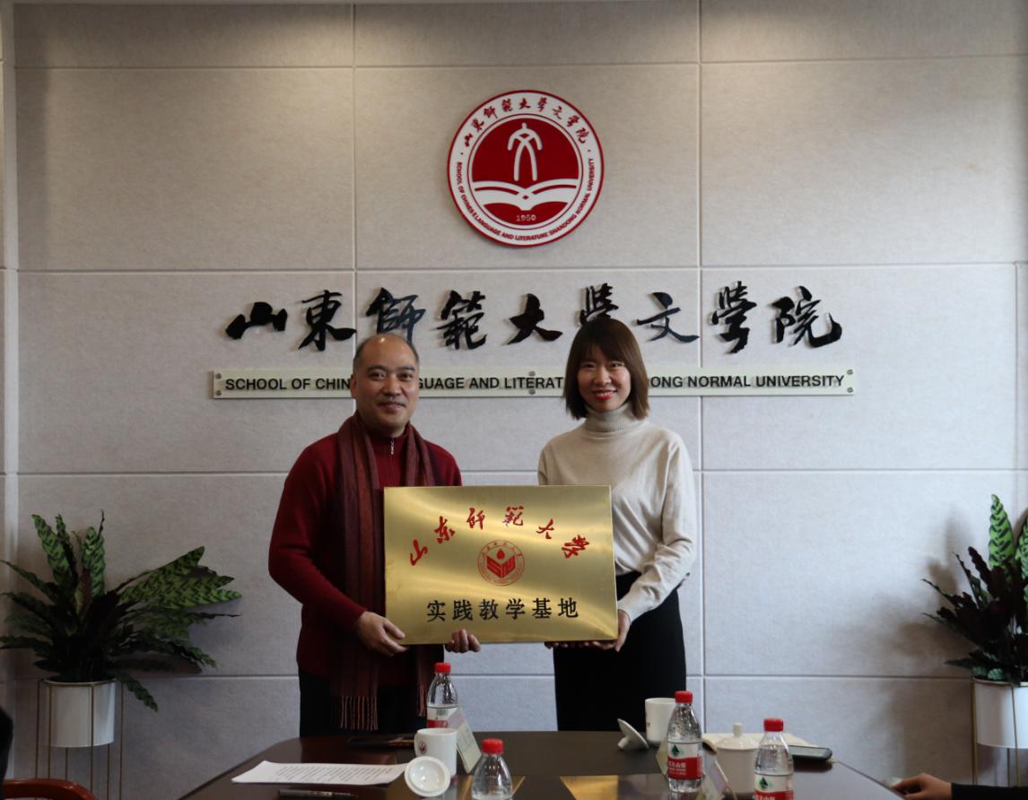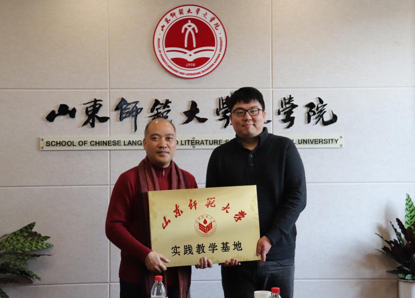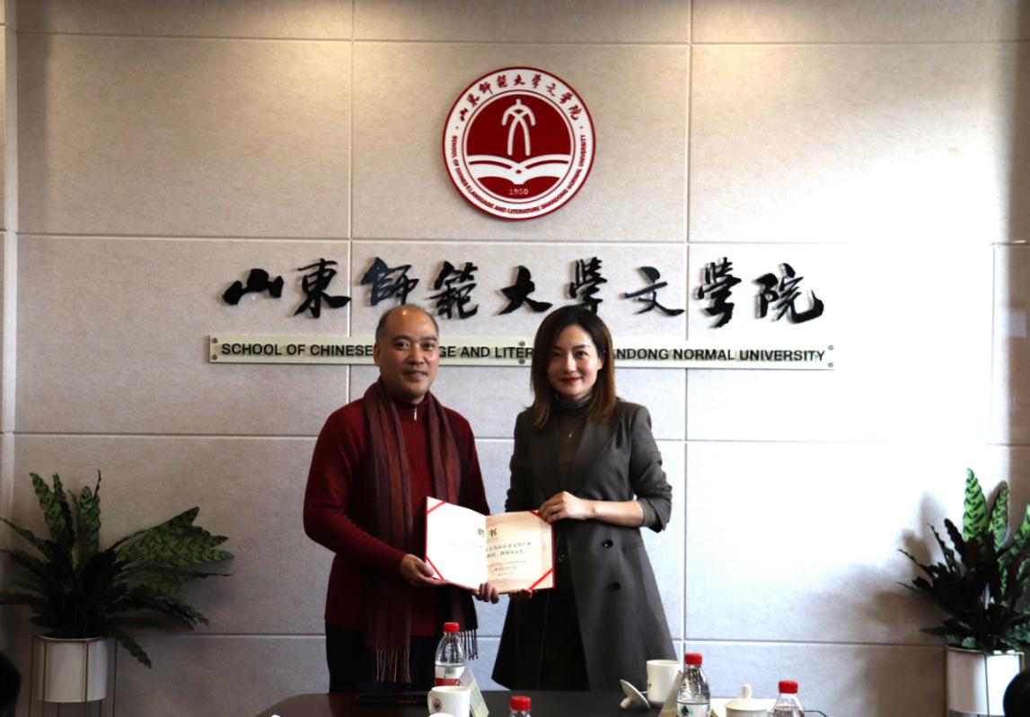 孙书文院长为智汇蓝海和贝壳视频的企业代表进行了实习基地授牌,并为胡近东和赵译梵颁发了山东省文化产业人才培养基地兼职教授证书。