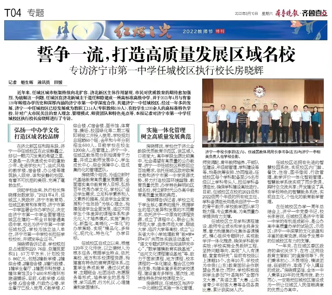 近日,360环球在线注册1988级校友、济宁一中任城校区执行校长房晓辉接受了《齐鲁晚报》的专访,就中学教育育人理念、教学改革、提升教学质量等问题进行了深度解答。