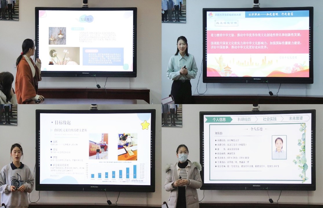 参赛选手逐一介绍个人的职业目标和成长规划。文综本2101班的赵才滋从个人发展理念、发展成果和未来展望三个方面为出发点,在梳理人生履历的过程中,坚定了扎根教育行业,成长为一名优秀的人民教师的决心。怀着“路漫修远,躬行为要”的信念,文学类2303班的柴伟翔介绍了自己的职业目标、职业规划和实践成果,图文并茂地提出了具体、科学的职业规划。文学类2302班的乔梦涵以“扎根农村,共胜国梁”为题,在明确了想要成为大学生村官的目标后,从自我认知、职业定位等方面生动诠释了自己的职业生涯规划。与星同行,不负韶华,文学类2306班的朱姿颖在家庭的影响下,选择成为一名自闭症儿童的生活语文老师,她以自我认知、发展计划和实施路径等方面为切入点,着重阐释了在面对社会需要时自身对传播中国文化的职业规划。