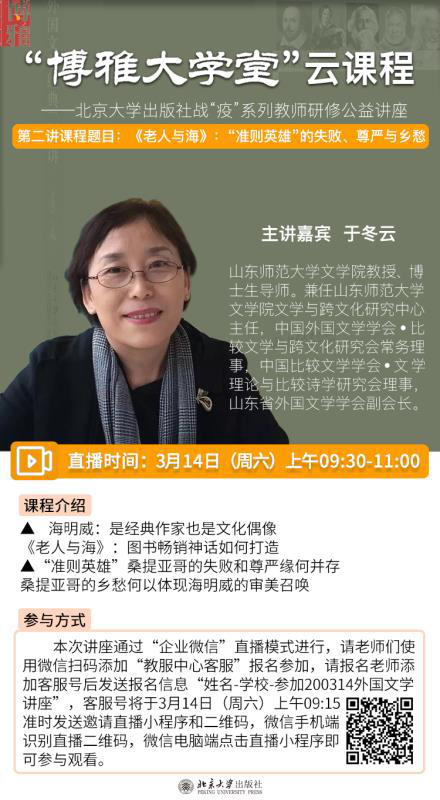 3月14日上午,我院于冬云教授受邀为“博雅大学堂”云课程作了题为“《老人与海》:‘准则英雄’的失败、尊严与乡愁”的学术报告。此次活动是由北京大学“博雅讲坛”和北京大学出版社联合举办的战“疫”系列教师研修公益讲座之二,共有来自全国高校外国文学等相关专业教师1500余人在线观看网络直播。