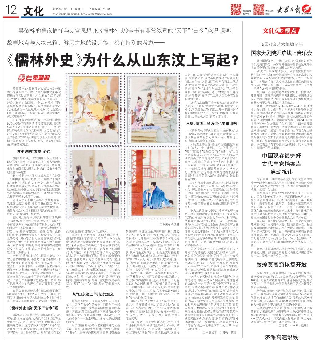5月13日,我院杜贵晨教授接受了《大众日报》专访,访谈以《<儒林外史>为什么从山东汶上写起?》为题刊发于《大众日报》第12版。