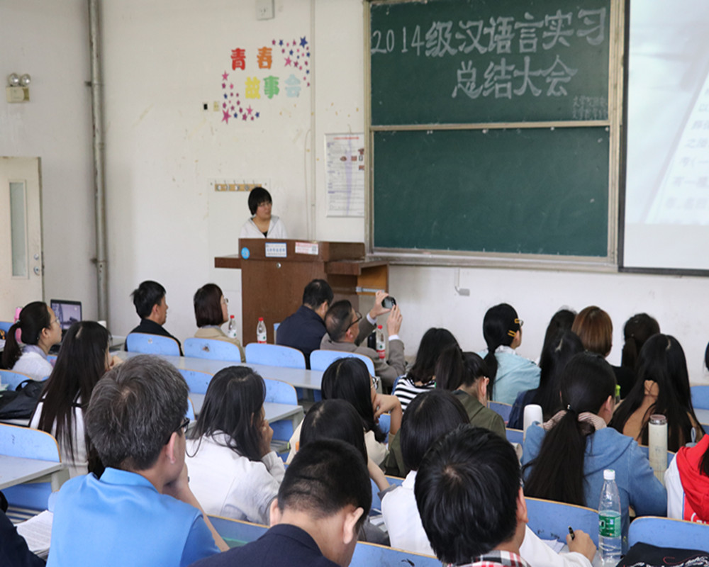 4月27日下午,360环球在线注册于长清湖校区综合教学楼C区218教室举办2014级汉语言专业实习总结大会。汉语言专业学生代表马宇腾担任主持人。汉语言专业教师沈基松,王兆鹏,云兴华,史冬青与2014级汉语言专业部分实习归来的同学认真聆听了此次实习总结大会。