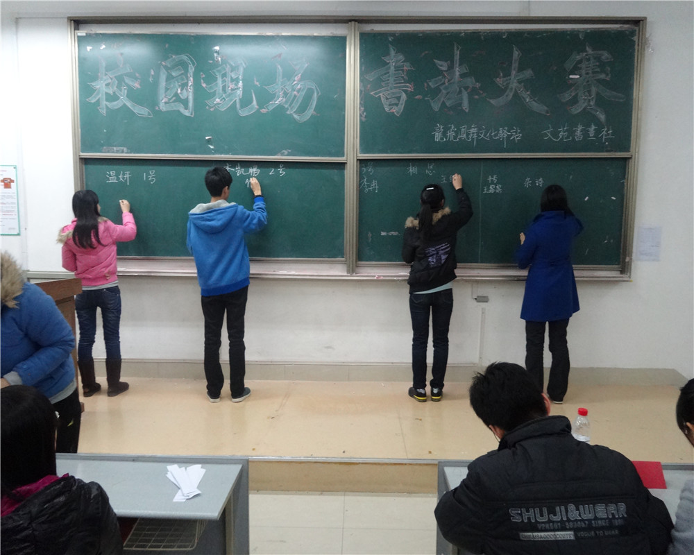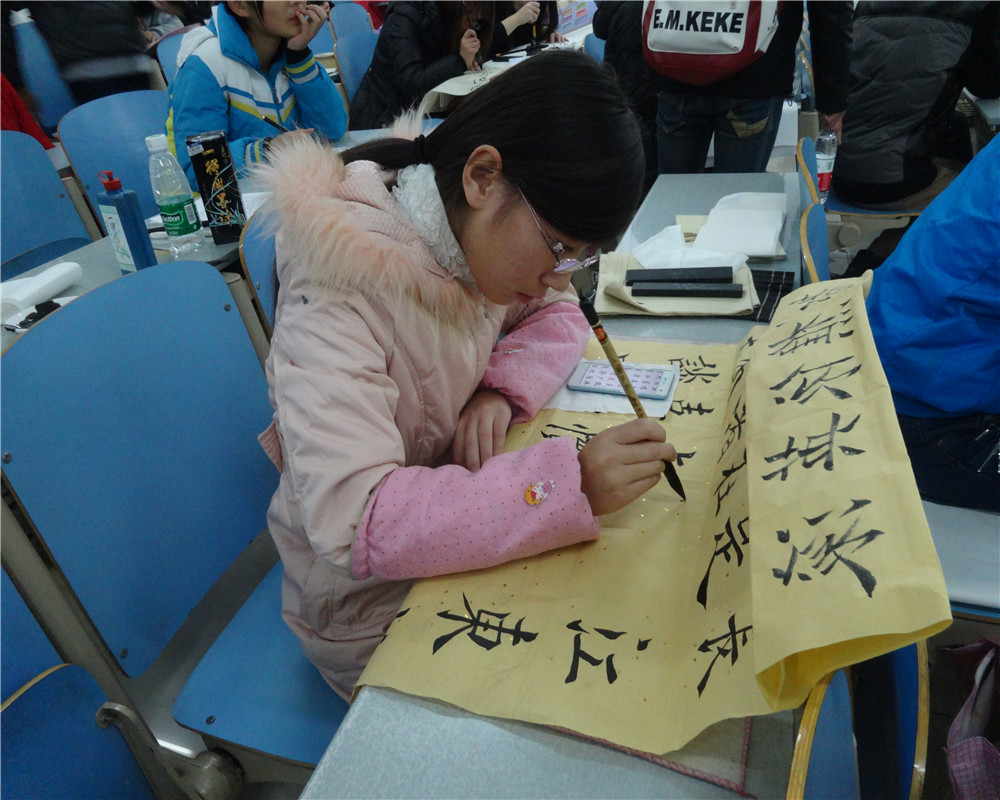本次大赛形式丰富,本着“风格自由,张扬个性”的宗旨,共涵盖了软笔、硬笔、粉笔以及国画四组赛项。在活动负责人宣布活动规则后,比赛正式拉开帷幕。在粉笔字比赛中,选手们随机分组上讲台进行板书,由评委进行现场打分。选手们各个镇静坦然,充分显示了书写者坚实的书法基础。再看软笔比赛现场,选手们挥毫泼墨,作品大有“浮云惊龙”之美感。值得一提的是,在硬笔书法比赛中,共收到六百多份富有特色的作品,成为此次比赛的一大亮点。整场比赛中,两个场地座无虚席,上交的作品中既有庄重大方的楷书,又有虚实灵动的行书,亦有潇洒飘逸的草书,更有追求个性的自创体,这也正体现了“风格自由,张扬个性”这一宗旨。据悉,此次比赛有来自各个学院各个年级八百多人次参加,而且作品水平较往年也有较大提高。