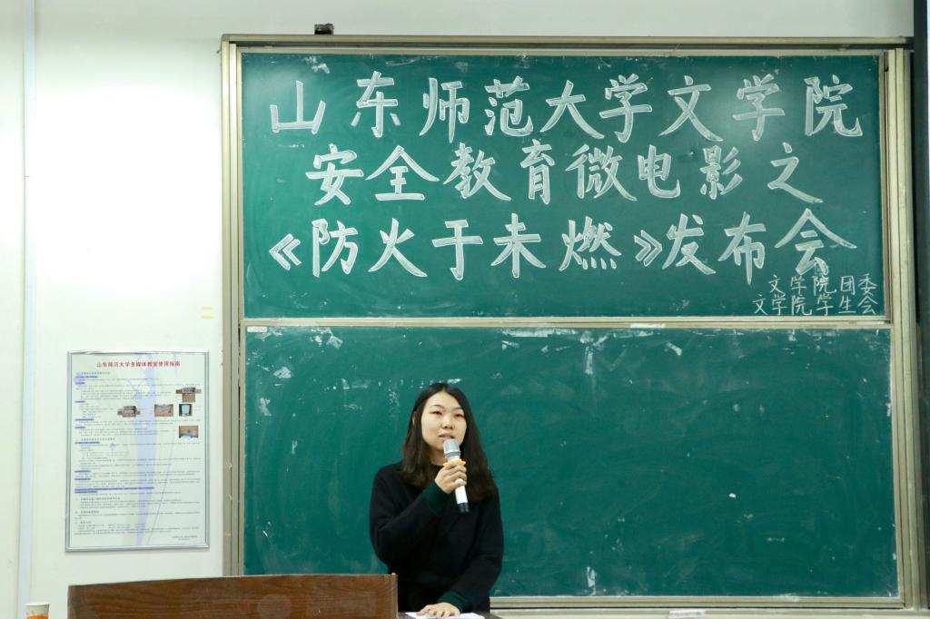 发布会初始,宫晓菁与在场同学一同回顾了文学院与长清区大学路派出所合作拍摄了三期以“防盗”、“防骗”和“反传销”为主题的“朱警官说防范”系列微电影。随后,李嘉琦老师作出简练致词,她以近年来学校本部校区女生宿舍着火和上海商学院火灾等具体事例告诫同学们要重视防范安全事故,在日常生活中要提高安全意识,防患于未燃。然后,宫晓菁播放了微电影《防患于未燃》,这部微电影讲述了男生宿舍四人因自恃做事谨慎而在宿舍内不顾卫生准则,肆意使用违章电器的一个故事。观影过程中,观众们都颇有共鸣,或掌声连连或阵阵喝彩。影片尾声并没有将结局演绎出来,旨在给观者留下想象的空白,以“无声胜有声”的方式来警醒同学们安全的重要性。紧接着,宫晓菁以访谈的形式邀请四位主创上台与同学们畅聊电影幕后的趣闻轶事。对于这部作品,兰润民谈到电影制作过程颇为漫长,拍摄过程中也遇到了各种瓶颈,并与观众们一同分享了拍摄花絮。此外,兰润民还对倾注了热情与心血的全体工作人员表达了感谢,希望能让观众们可以在观看影片之余能够真正认识到安全的重要性,提高自身的防患意识。值得一提的是,同学们积极与几位主创进行互动交流,几位主创也热情耐心地回答了观众们所提出的问题,使同学们进一步加强了安全责任意识。最后,兰润民宣读安全倡议书,向同学们发出了七点倡议,希望同学们从自我做起,成为有素质、有担当、有责任、有道德的当代大学生。宫晓菁引用汪国真的“只要热爱生命,一切都在意料之中”名言再次呼吁同学们要珍爱生命,远离火患,在以后的学习和生活中增强安全防范意识,提高火灾自救的能力,真正做到“防患于未燃”,一同守护校园安全。本次微电影发布会在同学们的热烈掌声中落下帷幕。