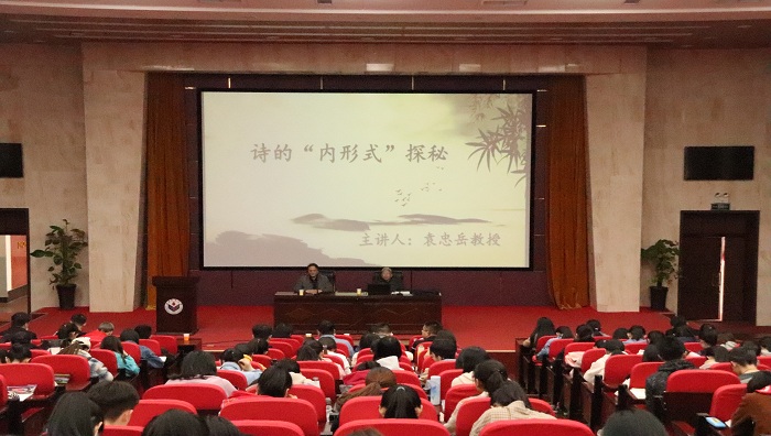 本次讲座袁忠岳教授围绕“诗的'内形式'”主题,从诗歌“内形式”的定义、指向、组成部分、叙述方式、结构层次、包含因素以及综合构成特点七个方面,援举古今中外的大量诗例进行了深入浅出的讲解。袁忠岳以自身学术经历为引,说明了诗歌“内形式”的基本含义、研究价值和研究现状。紧接着从七个方面具体阐述自己的诗歌“内形式”理论,每一部分理论之后都以具体诗歌讲解为例。首先,从诗歌“内形式”的概念开始,袁忠岳认为,在诗歌的“形式”与“内容”之间,存在一个“内形式”。外形式如衣服、内形式似皮肤,前者表达诗之形态,后者则紧贴内容,表达诗之意味。他以诗歌《一碗油盐饭》为例,向大家展示生发诗的意味的“内形式”的重要性。其二,“有意味”是“内形式”的唯一指向。袁忠岳借余光中的《乡愁》表达“诗最短,却时常一览无尽”的观点,告诉同学们有味道的诗才能让人千古传诵。其三,作为诗歌“内形式”的“意味”难以用“言”传,只好用“象”传之。“象”又通过“赋比兴”的方式来构造。袁忠岳借助孔子所说的“圣人立象以尽言”向同学们进行了相关阐释。接下来,袁忠岳又以深入浅出的语言,生动形象地讲解了其余四个部分,即:“起承转合”是“内形式”的基本叙述方式;“内形式”的单线结构和多线结构;“内形式”的时空因素与视角因素;“内形式”构成的综合性。八十三岁高龄的袁忠岳教授以洪亮的声音、丰富的肢体语言、清晰的思路、流畅的表达一口气讲了两个小时,给同学们留下了深刻的印象。到互动环节时,袁忠岳耐心解答大家的问题并鼓励大家踊跃发言,连珠妙语赢得阵阵喝彩。报告结束后,由中国现当代文学2017级研究生赵京强同学进行点评,他指出我们应该对袁老师的讲座有更深层理解,这场讲座的真正价值不止在于让大家今后读诗的时候注意到“内形式”的欣赏角度,更在于启发了大家的学术思路,勇于树立学术理想,努力从前人学术研究的大厦中拓展出新的研究领域。